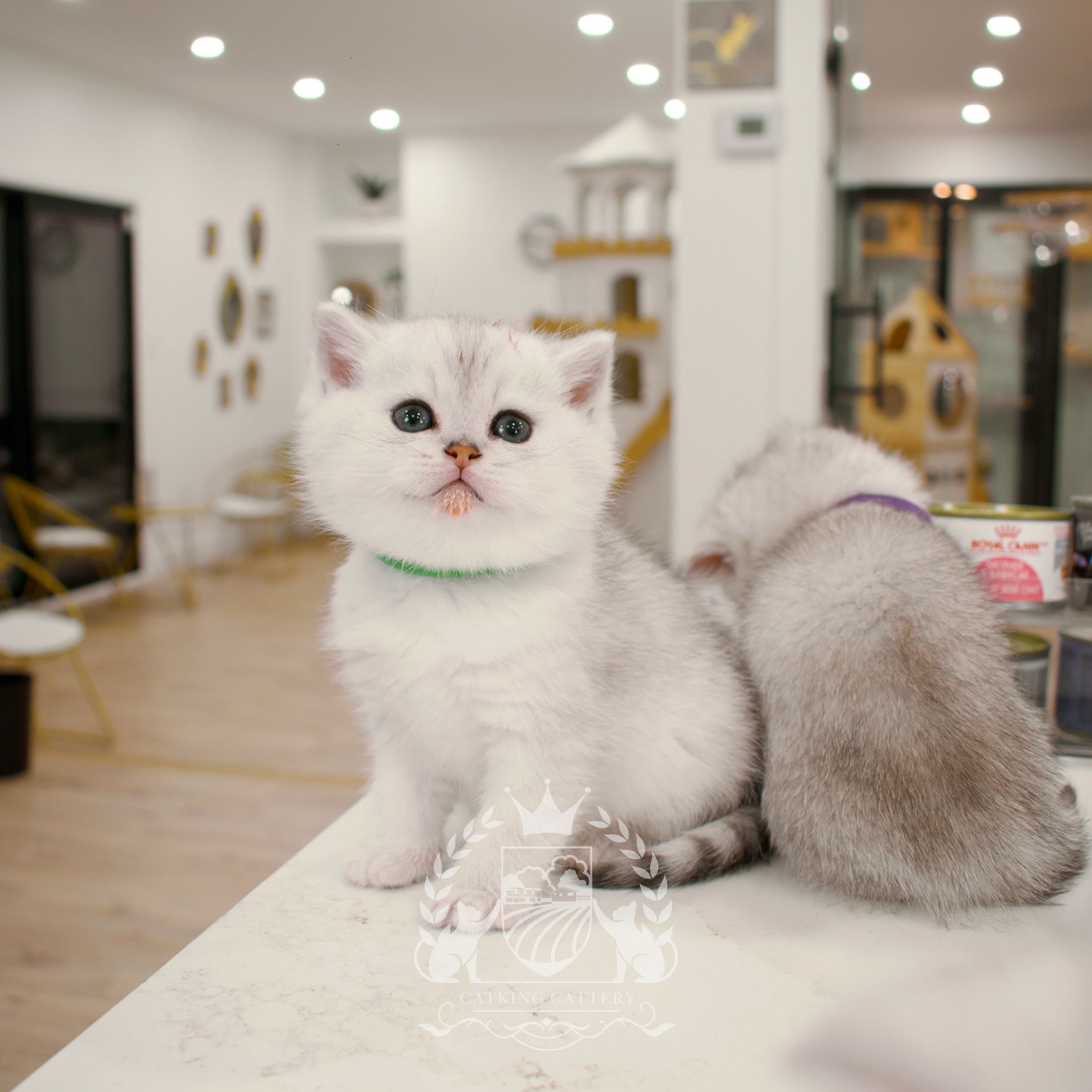 Bear is the one that has the biggest body and firmest arms and legs in this litter with a green collar. He has an absolutely big and rounded head, rounded eyes, muzzle and ears. His muscular body made him the first kitten that learned walking.