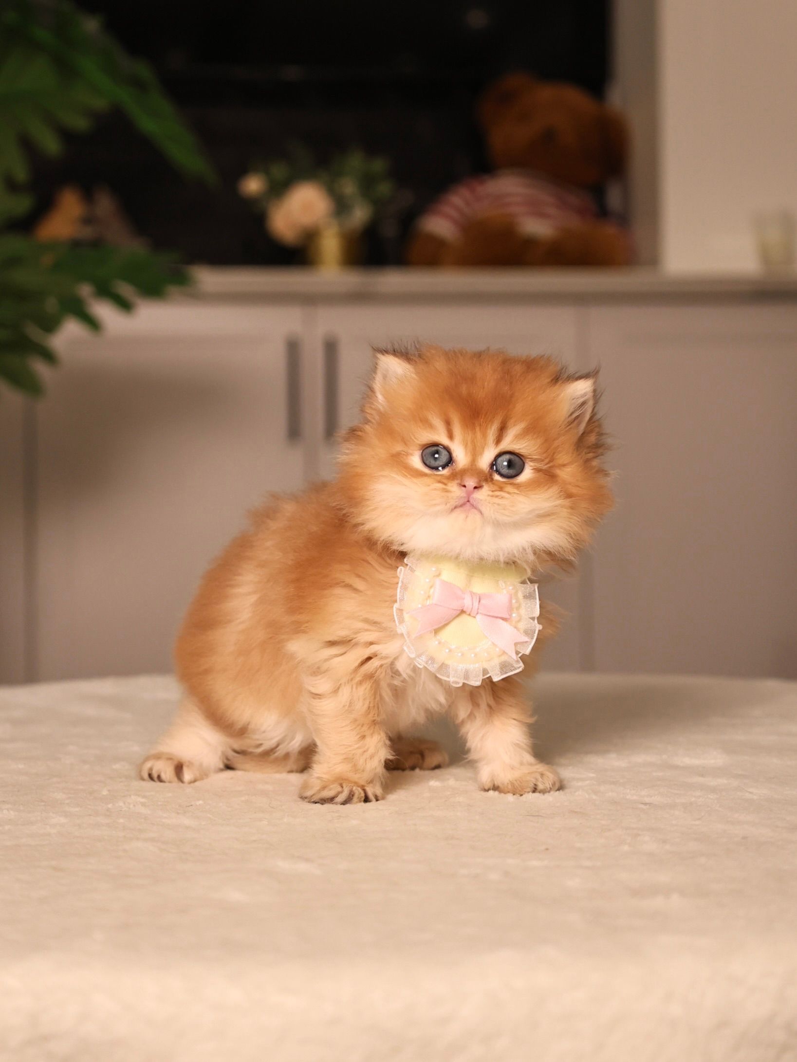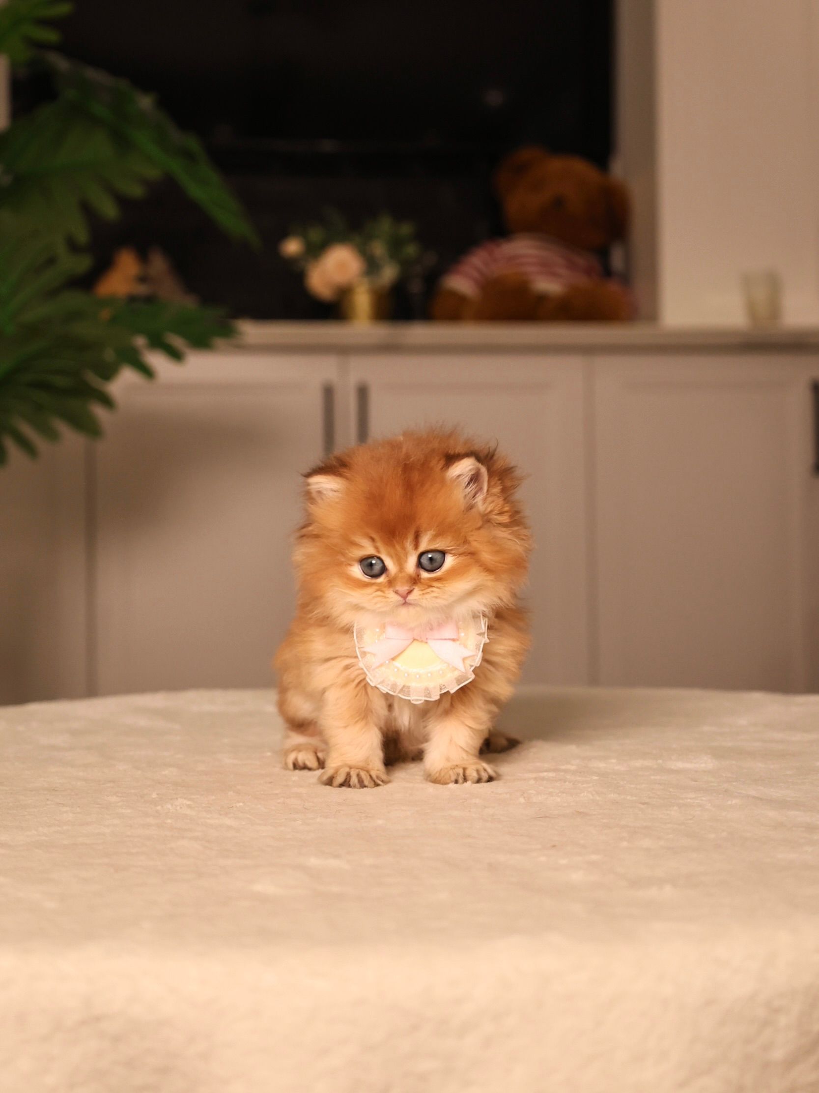 Lester is a fluffy golden puffball with the softest, most glowing long coat who looks like a bag of chocolate! His golden shading is rich and warm, and his fur is plush like a tiny sunlit cloud. Even now, his bone structure is remarkable — round skull, strong muzzle, and impressive future coat volume. His personality is gentle and cuddly, making him the kind of kitten who melts into your hands and loves being close to people.